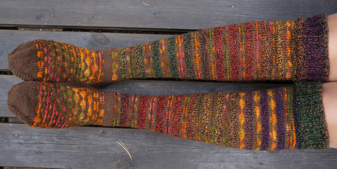 Sain syntymäpäivälahjatoiveen pitkistä ja retroista villasukista, joissa olisi ainakin ruskeaa, mielellään vihreää ja oranssiakin. Täytyy myöntää, että alkuun löi kyllä tyhjempää kuin aikoihin, mutta lopulta katselin rauhassa lankavarastoani läpi ja löysin projektiin sopivat kerät. Alku ei ollut ongelmaton, vaan neuloin molemmat jalkateröt kahteen otteeseen, kun niistä olisi muuten tullut liian ahtaat ja pitkät. Kammo.