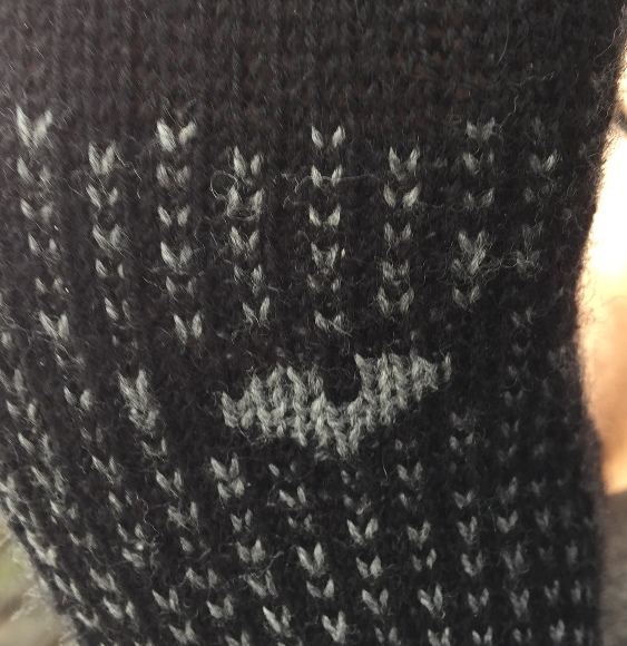 Poikani pitää siis Game of Thrones-sarjasta ja hänen suosikkinsa on Stark, jonka motto on Winter is coming. Stark-kaavion löysin Ravelrysta yhdestä ilmaislapasohjeesta. Vähän sitä muokkailin. Tekstikaavion suunnittelin itse. Sitä oli vähän hankala kuvata, kun se kiertää vartta. Ehkä jonkin käsityksen kuitenkin saa. Yöllä näitä väsätessäni päätin kääntää keskimmäisen tekstin jotenkin ihmeellisesti ylösalaisin/peilikuvaksi, se nyt ei ehkä ollut ihan paras idea.